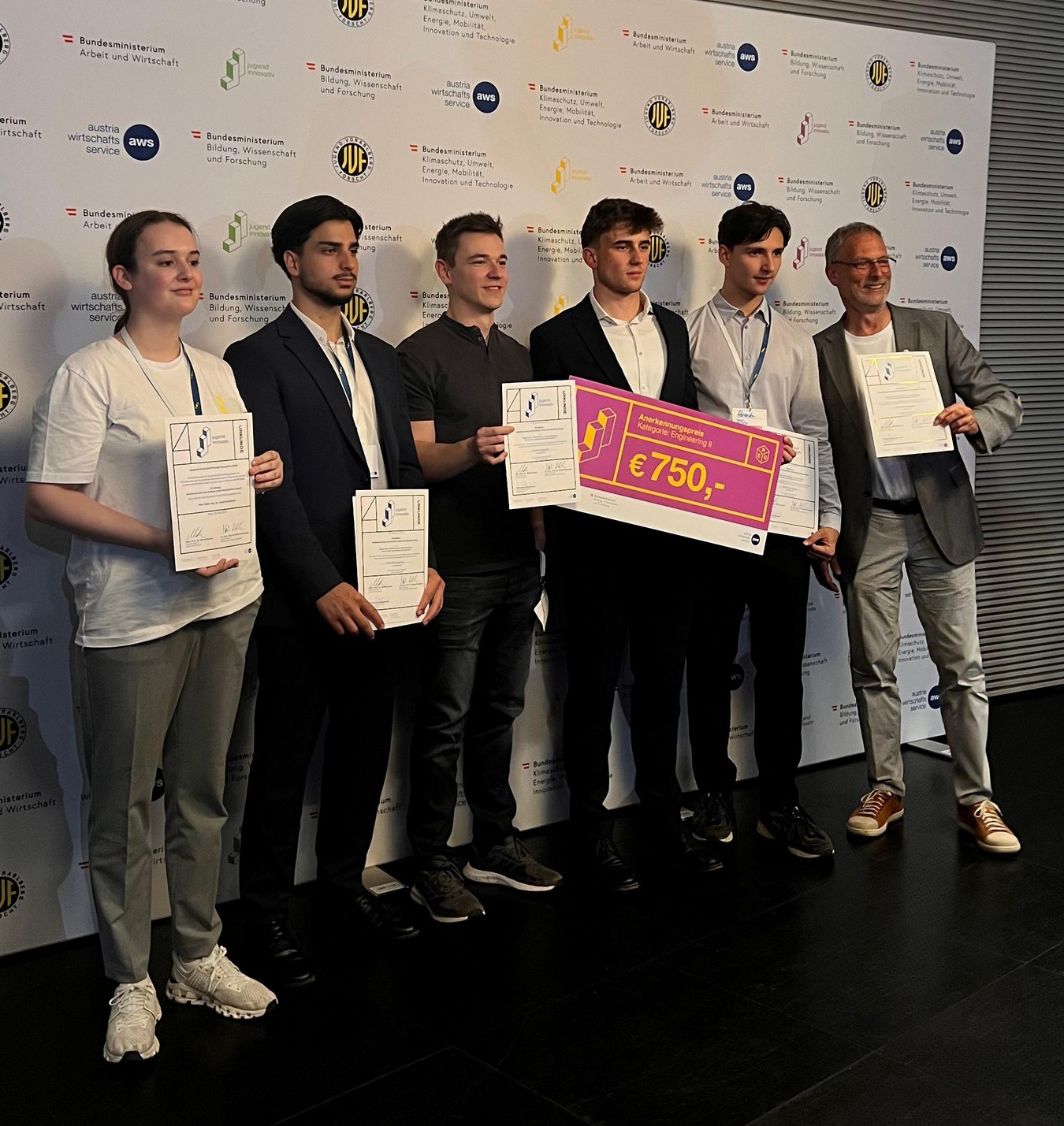 Preisverleihung: Sophia Helmreich, Yusuf Sert, Silvan Remus, Paul Eichinger, Toni Parenta und Betreuer Prof. Dr. Kollmitzer (von links), abwesend Nergiz Ciftci