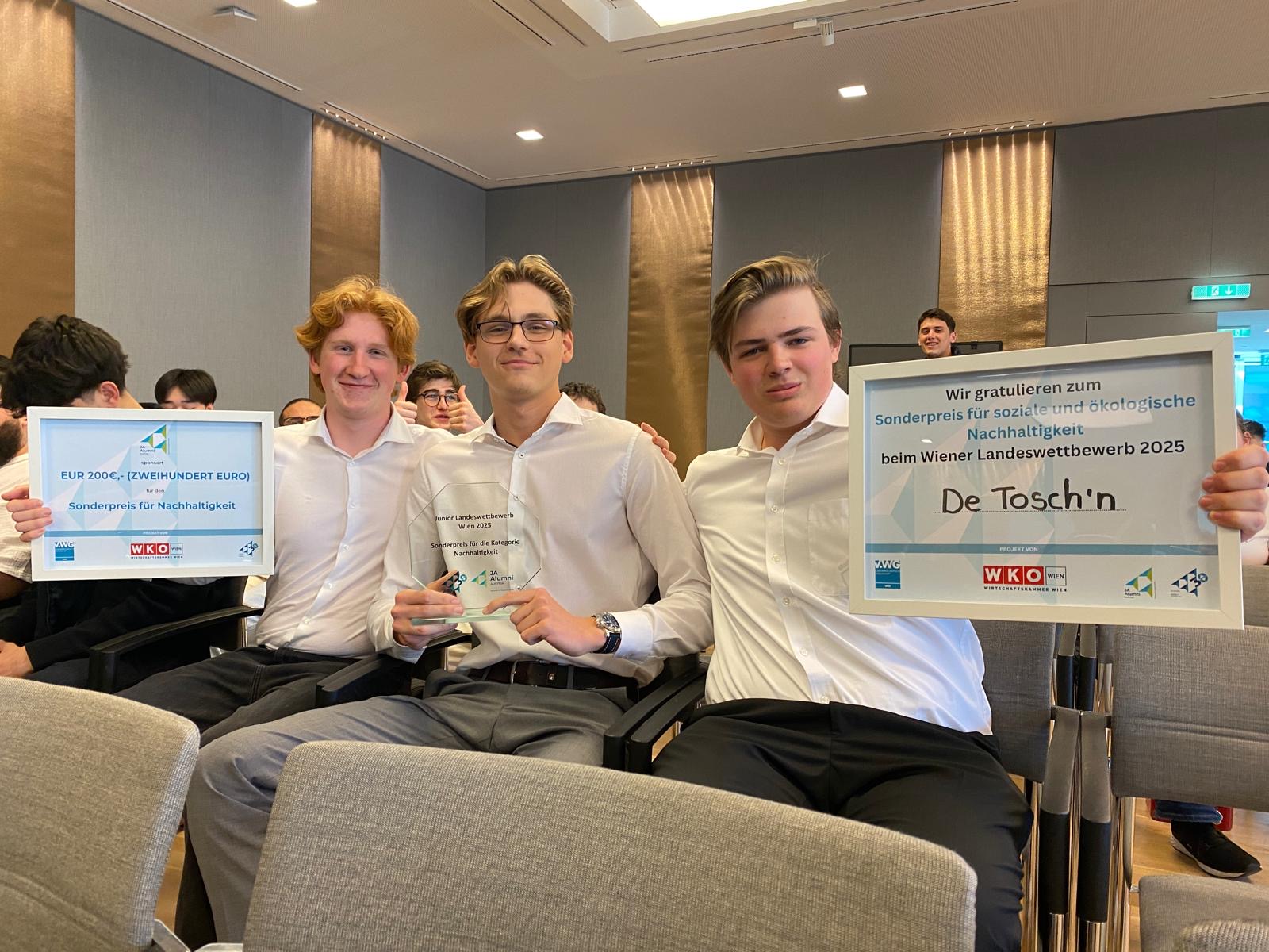 Am 30.4.2025 wurde die Junior Company De Toschn beim Wiener Landeswettbewerb mit dem Sonderpreis für soziale und ökologische Nachhaltigkeit ausgezeichnet.
