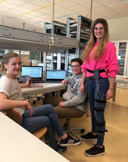 Bisher haben die Schülerinnen die passiven Dämpfungseigenschaften durch Messungen sehr nahe am Knie bestimmt (die Schülerin am Bild ganz rechts trägt die Sensoren am linken Bein). Das betrifft die Funktion der Gelenksknorpel und von Innen- und Außen- Meniskus. Im Weiteren sollen aber auch die aktiven Dämpfungseigenschaften der Kniestrecker gemessen werden. Das wird dadurch geschehen, dass die Sensoren kniefern an Hüfte und Sprunggelenk angebracht werden.