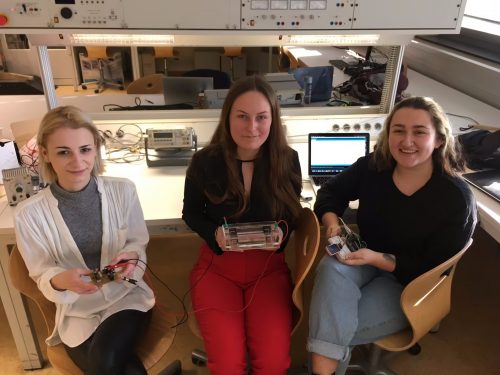 Die Elektrophorese wird bei der Analyse von Nukleinsäuren oder Proteinen verwendet. Dabei transportiert der elektrische Strom die verschiedenen Moleküle einer Probe, je nach ihrer Beweglichkeit, in einer vorgegebenen Zeit verschieden weit. Dafür werden eine sehr konstante Spanungsquelle, eine Elektrophoresekammer und ein Kontrollgerät zur Überwachung benötigt. Diese einzelnen Komponenten präsentieren unsere Schülerinnen im Bild von links nach rechts. Jedes Einzelteil wurde von den Schülerinnen unter tatkräftiger Mithilfe der Werkstättenlehrer selbst gefertigt. Dieses Gerät wird dann in Zukunft im Zellkulturlabor zur Analyse in den Laborübungen genutzt werden.